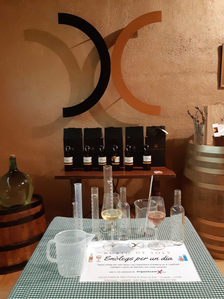 “Enòlegs per un dia: es una activitat específica, que consisteix en posar-se en la pell de l’enòleg per unes hores i viure l’experiència d’elaborar el teu propi vi. Es realitzarà un taller complert, per aprendre a valorar un vi a nivell organolèptic, disposar de material tècnic necessari per fer una coupage, que consisteix en una pràctica enològica baix teu criteri personal. Opcional: fer la visita guiada entre les vinyes i el celler. Tot acompanyat i guiat per la enòloga, viticultora i propietària del celler Rubió de Sòls.”